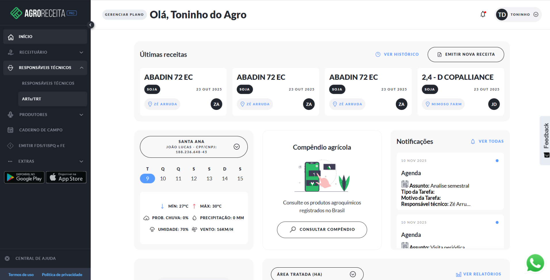 1 – Para cadastrar sua ART, acesse a plataforma do AgroReceita, faça o login e clique no menu ao lado em: