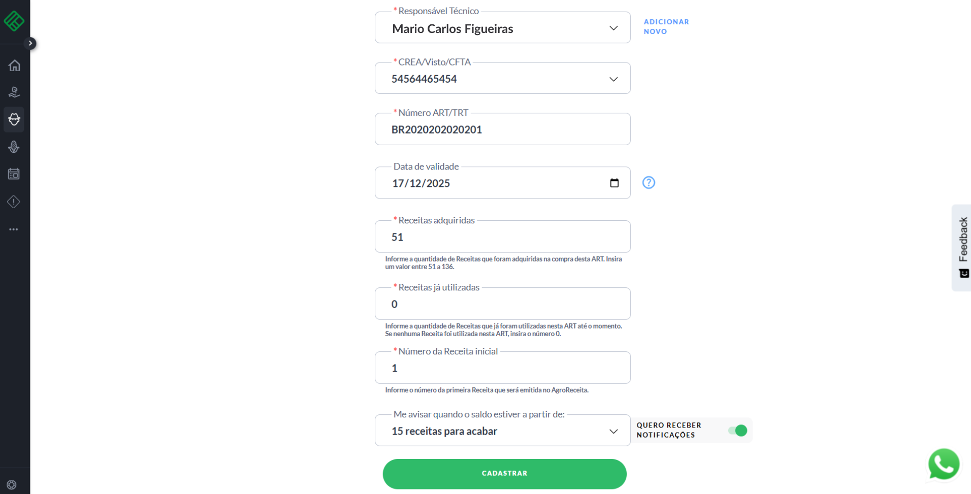 • Informe a Quantidade de Receitas que foram adquiridas junto ao CREA para essa ART. Cada estado possui regras diferentes para aquisição de ART de receituários agronômicos. Em caso de dúvidas, entre em contato com o CREA de sua região;