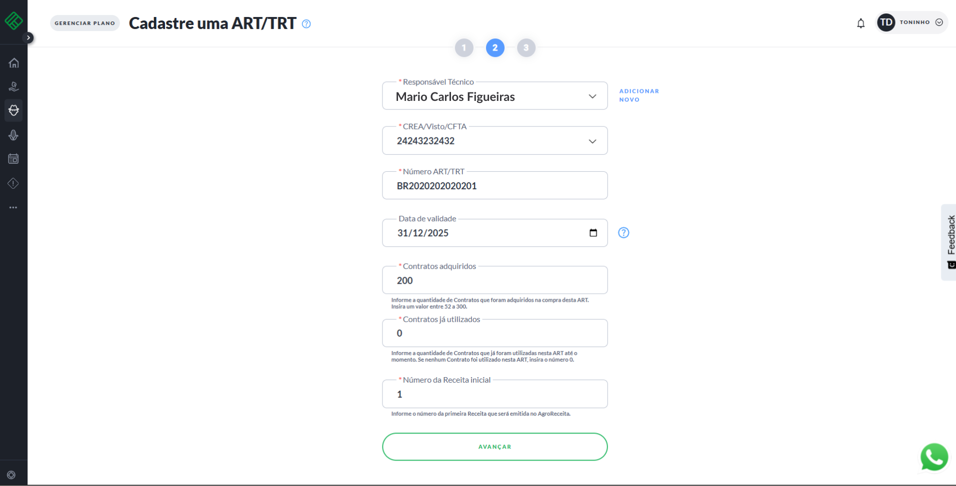 • Caso já tenha emitido receitas com este número de ART, informe aqui a numeração do próximo contratante a ser emitido pelo AgroReceita. Exemplo: Se antes de usar o AgroReceita você já emitiu 15 receitas para 15 contratantes com essa ART, sua próxima receita inicial será a de número 16;