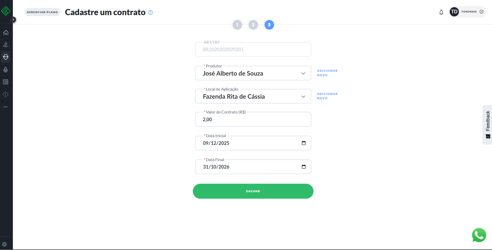 • Nome do produtor. Caso ainda não tenha nenhum cadastrado em sua conta, clique no botão “Adicionar Novo” e preencha o cadastro de seu produtor e, na sequência, do local de aplicação;