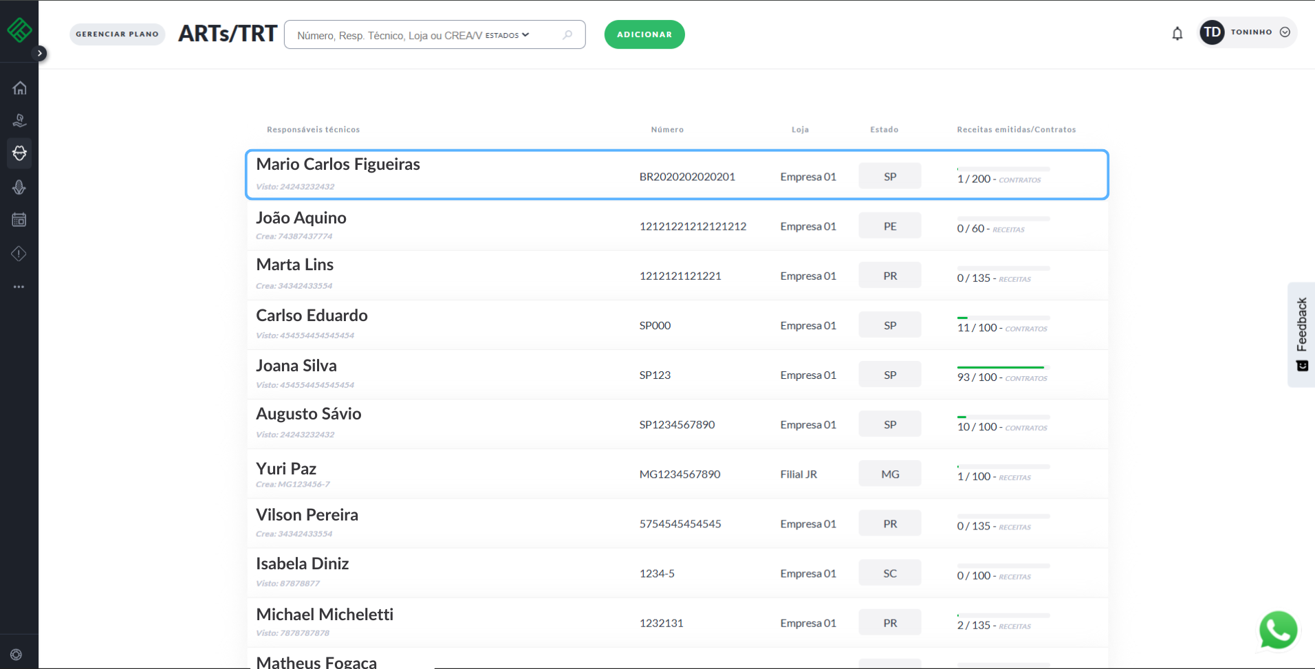 • Quantidade de contratos adquiridos em sua ART junto ao CREA, podendo ser de 52 a 300 contratos. Cada contrato representa um contratante. Para maiores informações consulte o CREA SP;