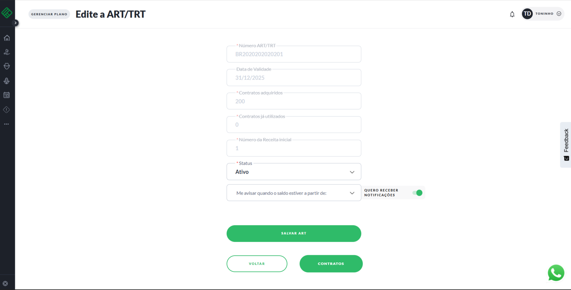 • Ative notificações para receber um aviso do sistema quando o saldo de receitas de sua ART estiver acabando. Você pode habilitar a partir de: