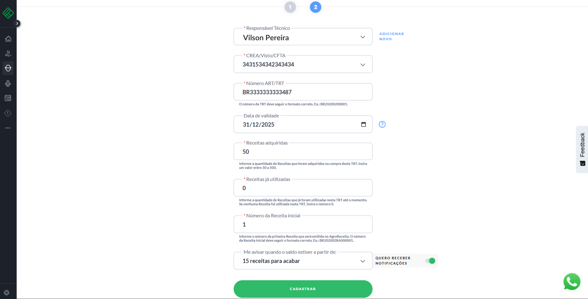 • Informe a Quantidade de Receitas: para os técnicos agrícolas, o CFTA permite a emissão de 50 a 500 receitas por TRT;
