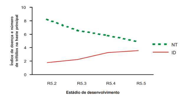 Resposta de 31 cultivares de soja à ferrugem ao longo dos estádios fenológicos (NT = número de trifólios; ID = índice de doença). Fonte: ANDRADE, Paulino José Melo; ANDRADE, Donita Figueiredo de Alencar Araripe (2025).