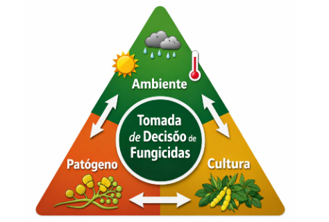 Interação entre ambiente, patógeno e cultura na tomada de decisão para uso de fungicidas. Fonte: Alasse Oliveira da Silva (2026).