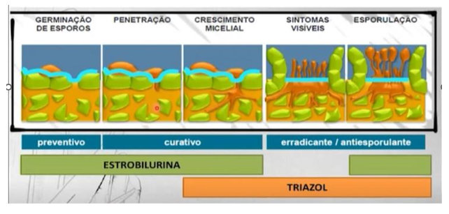 A associação entre triazóis e estrobilurinas consolidou-se como padrão em diversos sistemas produtivos. Os triazóis atuam na inibição da biossíntese de ergosterol, comprometendo a integridade da membrana celular dos fungos, enquanto as estrobilurinas interferem na respiração mitocondrial (FRAC, 2023).